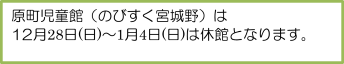| 2024年も残り少なくなりました。 今年もたくさんの方々に原町児童館(のびすく宮城野)をご利用いただきありがとうございました。 時が過ぎるのは早いもので、このあいだまで暑いと思っていたら、もう年の瀬です。 年末年始は、帰省される方、おうちでゆっくりする方、久しぶりにお友だちに会う方など、楽しい計画を予定されているご家庭も多いのではないかと思います。 まだまだ寒い季節が続きますので、身体に気をつけてお過ごしください。 のびすくは、来年もいろいろなイベントを企画していますので、たくさん遊びに来てくださいね。 1月には、「小正月」や「スペシャルパパタイム」などがあります! 新年がみなさんにとって、良い一年でありますように願っております♡ ★小正月をたのしもう★(子育て支援クラブみやぎ~の共催) ビニール袋でたこ作りやこま作りをします。 参加した方には赤飯のお振舞いがあります。 日時:1月11日(土) 10時30分~11時30分 対象/定員:乳幼児親子30組/小学生20名(定員になり次第締め切り) 申込み:受付中 ※小学生は、別チラシにて申込み下さい。 ★スペシャルパパタイム★(宮城野区家庭健康課共催) 子育て体験談やふれ合い遊び、絵本の紹介 日時:1月25日(土)10時00分~11時00分 対象:0歳児~1歳6か月児とその父親(母親も可) 定員:20名(定員になり次第締め切り) 持ち物:バスタオル(0歳児のみ) 申込み:1月6日(月)から 講師:特定非営利活動法人ゆうわ 理事長 齋藤 勇介氏 となりの保育士 代表 曽根 靖子氏 榴岡図書館 |